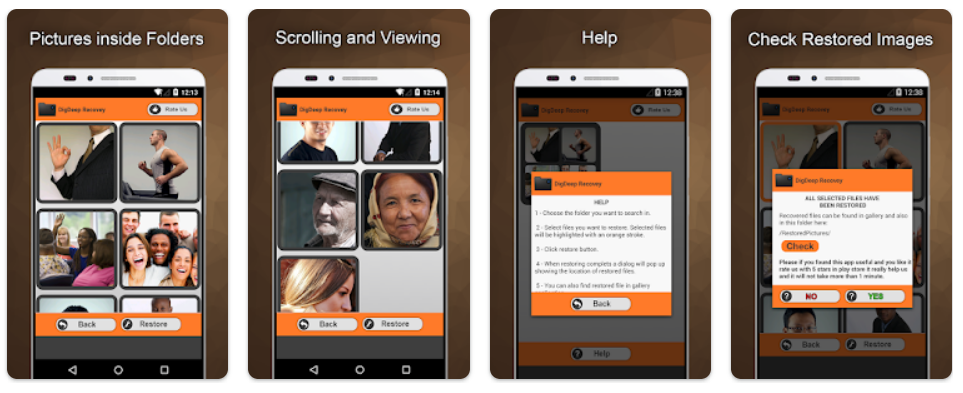 DigDeep Image Recovery es una excelente solución para recuperar imágenes en formato PNG, JPEG o JPG. Esta aplicación examina la memoria principal del dispositivo en busca de imágenes eliminadas, permitiendo su recuperación. Además de la memoria interna, puedes recuperar imágenes también de tarjetas SD. Solo selecciona esta opción en la aplicación. Después del escaneo, selecciona las imágenes que deseas recuperar. A diferencia de DiskDigger, DigDeep no requiere permisos de root, lo que hace que la recuperación sea un poco menos precisa.